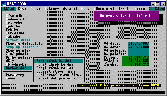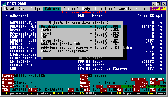 Obrazovka po stisku klávesy F10 - export dat do jiných formátů