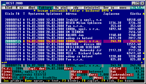 Adresář odběratelů, seznam vystavených faktur, seznam přijatých faktur, výpočet DPH, adresář obchodních kontaktů (potenciální zákazníci, potenciální dodavatelé, služby, známí apod.), seznam výpisů z bankovního účtu, seznam bankovních účtů, seznam bankovních ústavů, kurzovní lístek, seznam oborů v adresářích, seznam telefonních předvoleb obcí ČR a SR a jejich PSČ, seznam konstantních symbolů na fakturách, seznam číselných řad pro vystavené faktury, nastavení parametrů subsystému FAKTURY.