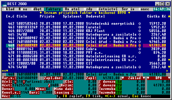 Ve všech zobrazených tabulkách je maximálně využito možností programu Fox Pro jako relačního databázového systému. U seznamů s velkým počtem sloupců (jako jsou adresáře, seznamy faktur apod.) jsou informace na obrazovce rozmístěny tak, aby bylo dosaženo zobrazení všech důležitých informací dostupných v jednom záznamu. Navíc je možno měnit velikost a pořadí jednotlivých sloupců, což využijete u rozsáhlejších tabulek, kde se všechny sloupce nevejdou na obrazovku. Můžete si tak zvolit, které sloupce vás v danou chvíli nejvíce zajímají.