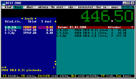 Prodej (kasa), číselník skladovaných položek, seznam tržeb, seznam pohybů ve skladu, nastavení parametrů subsystému KASA.