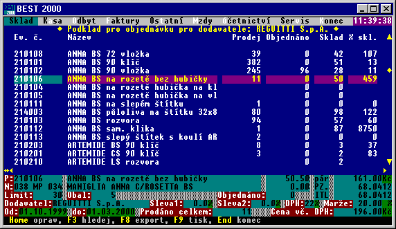 Ve funkci Objednávky si můžete jednoduše sestavit objednávku pro vašeho dodavatele na doplnění skladových zásob. Jednoduše si vyberete dodavatele, zadáte datum od-do a program vám vypočítá kolik jste každé položky prodali měrných jednotek, kolik máte procent skladem proti vypočítanému prodanému množství a stejně jednoduše zadáte množství pro objednávku s ohledem na zobrazené množství v jednom obalu (krabici).