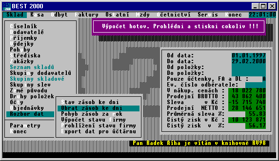 V celém programu (tj. v databázích, v datumových výrazech a ve všech početních operacích, kde se pracuje s datumem či datumovými výrazy) je rok prezentován vždy čtyřmístným číslem. Všechny výpočty, ve kterých se vyskytuje datumový výraz, jsou prováděny tak, aby byla v rámci tohoto programu zajištěna správná funkčnost programu po 1. lednu 2000.