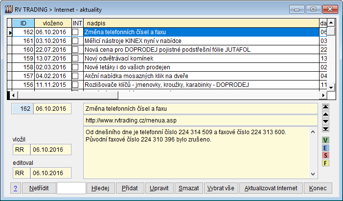 správa aktualit volitelná funkce zapíše informace o aktuálním dění ve firmě do databáze na internetu
