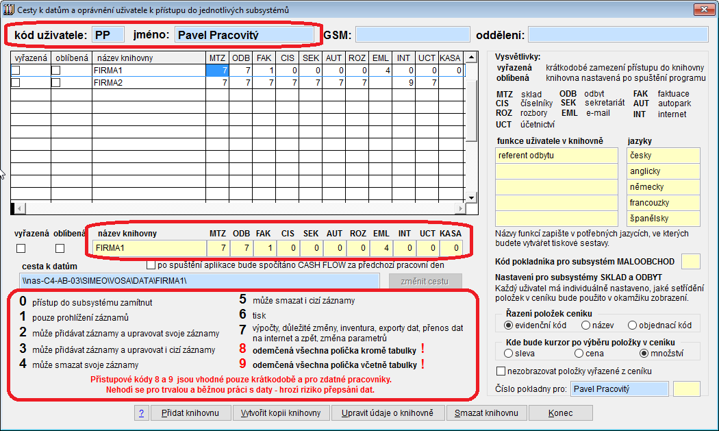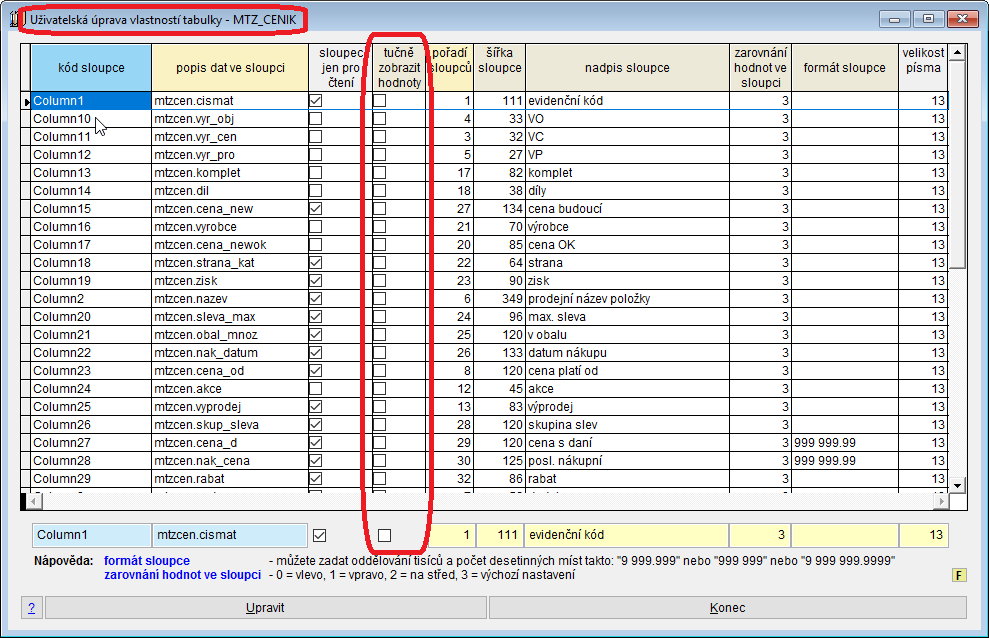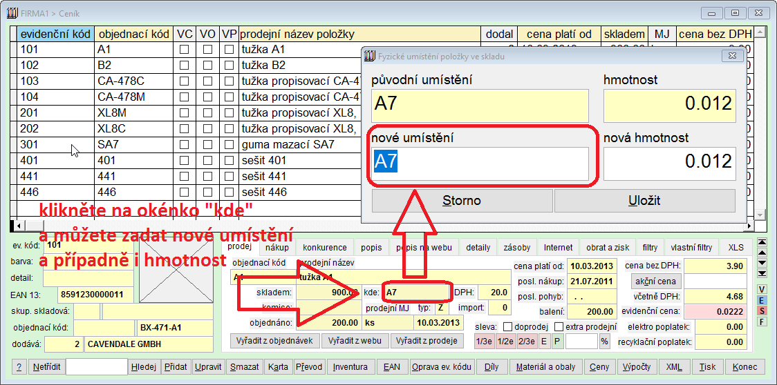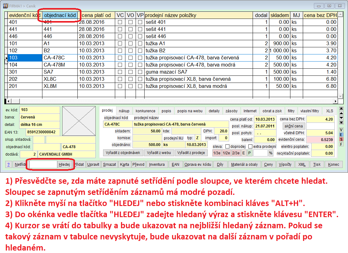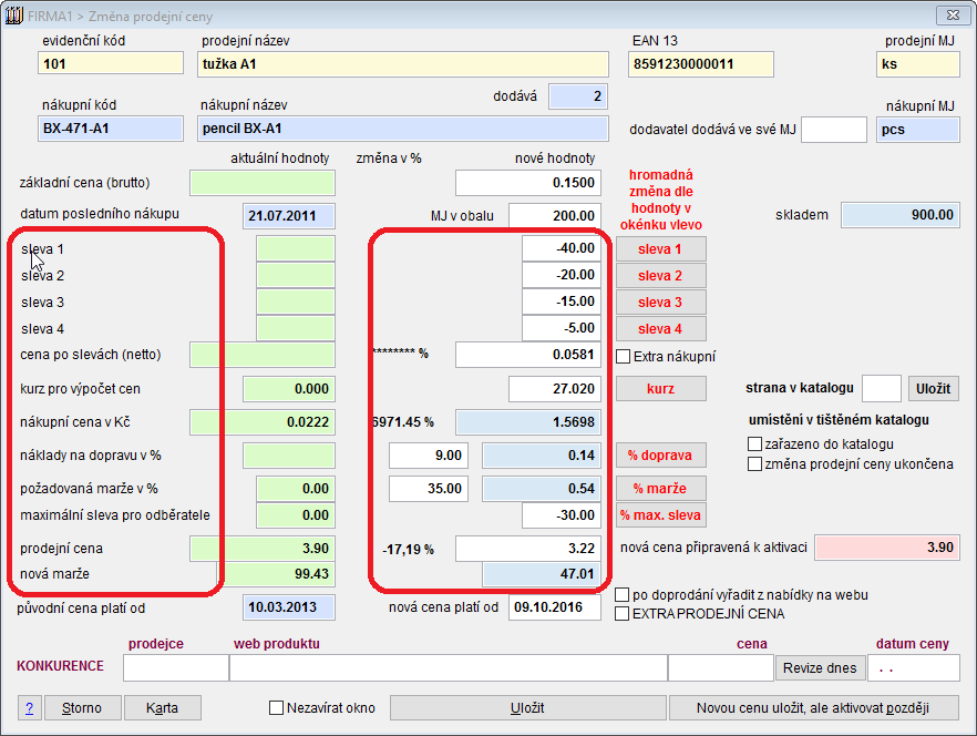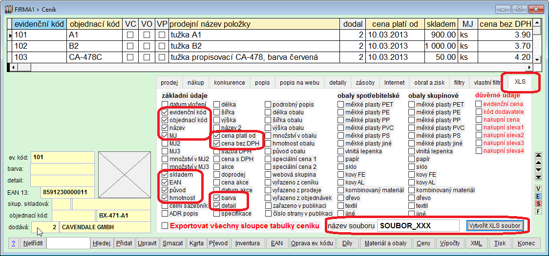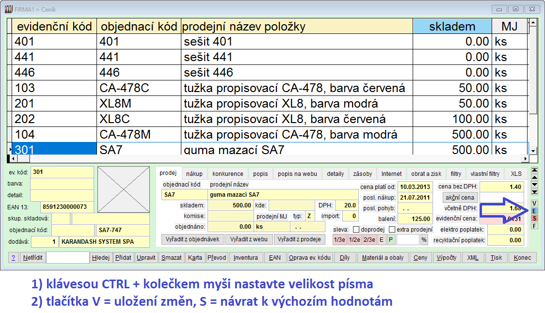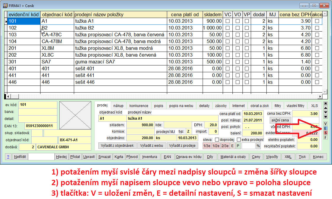 ceník položek rozsáhlé možnosti pro zadání potřebných údajů pro položky ceníku