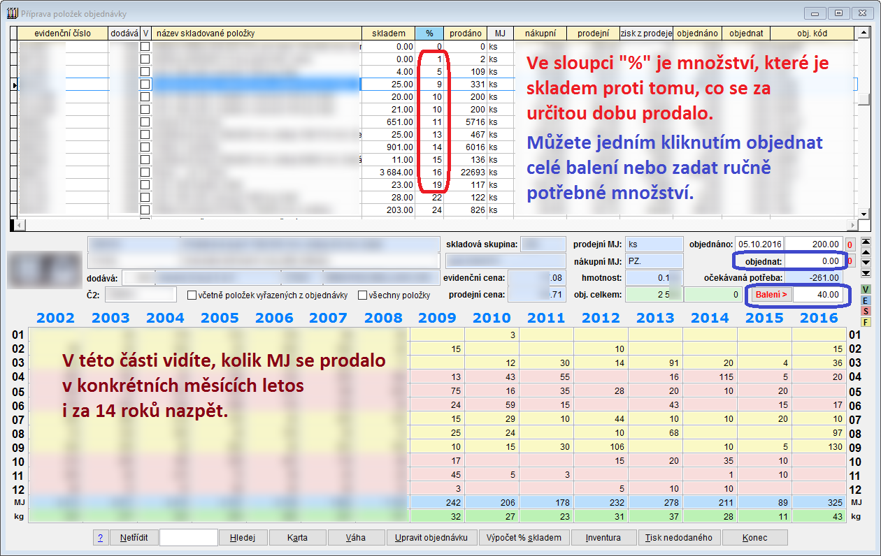 objednávka zboží přehledně vidíte, kolik procent máte kterého zboží a na jedno kliknutí objednáte po celých baleních před objednávkou zboží vidíte, kolik se který měsíc prodalo za 10 roků zpět